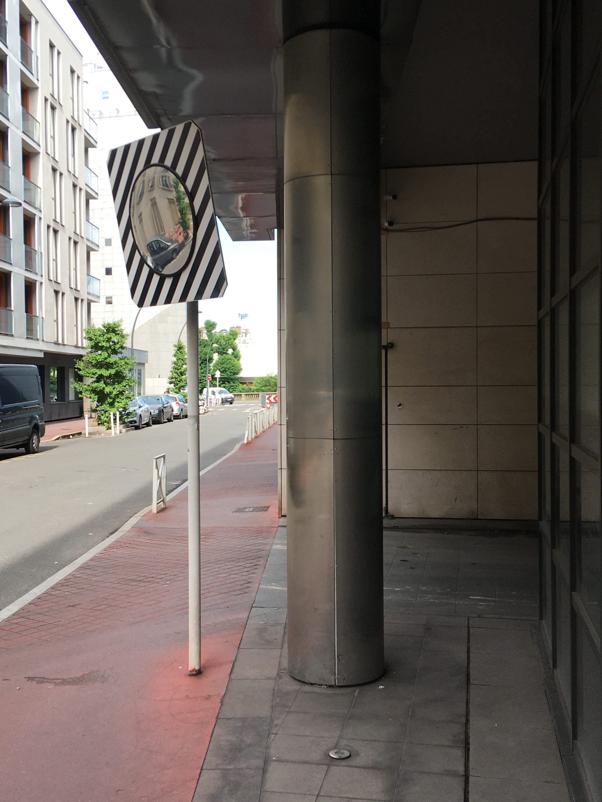 Ces poteaux sont habillés d’une tôle inoxydable qui suit la géométrie des éléments porteurs. À l’origine, la conception architecturale poussait dans un sens d’écriture d’un socle minimaliste teinté de contraste entre métal thermolaqué noir en contraste de l’aspect minéral de la rue.