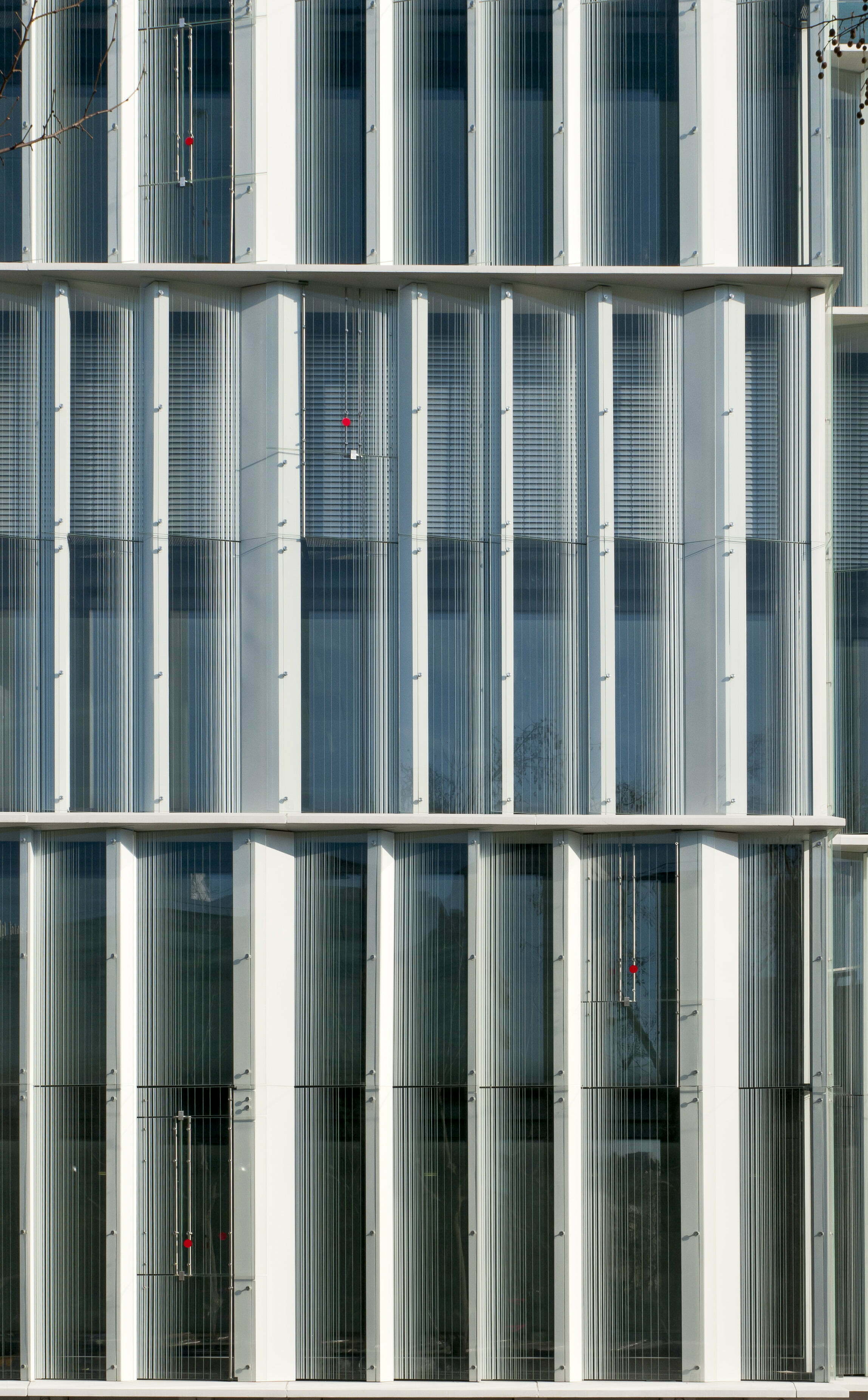 Originellement constitué de trois bâtiments indépendants, le projet liaisonne les bâtiments entre eux et en change l’image dans une vision globale et cohérente. Les jardins contribuent à créer un paysage unitaire à l’échelle de la parcelle. La SHON est valorisée tant en infrastructure qu’en superstructure avec un gain de 18%. La façade sur l’avenue, conçue comme un voilage immatériel mettant en scène les reflets changeant de la course du soleil, affirme d’emblée la modernité de l’intervention et son ambition architecturale et urbaine.