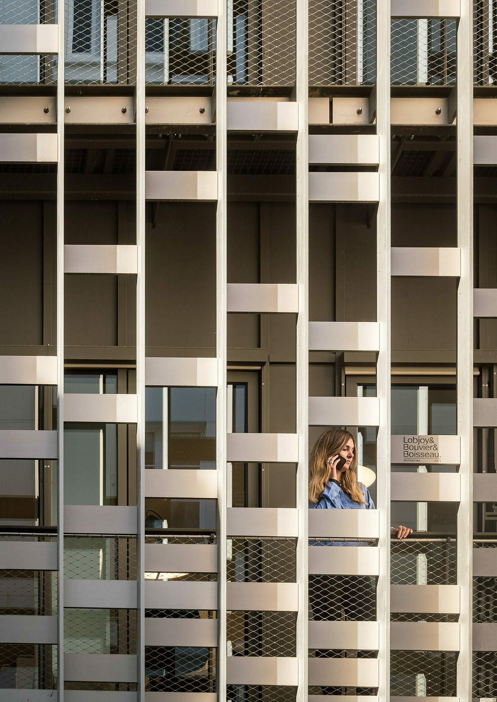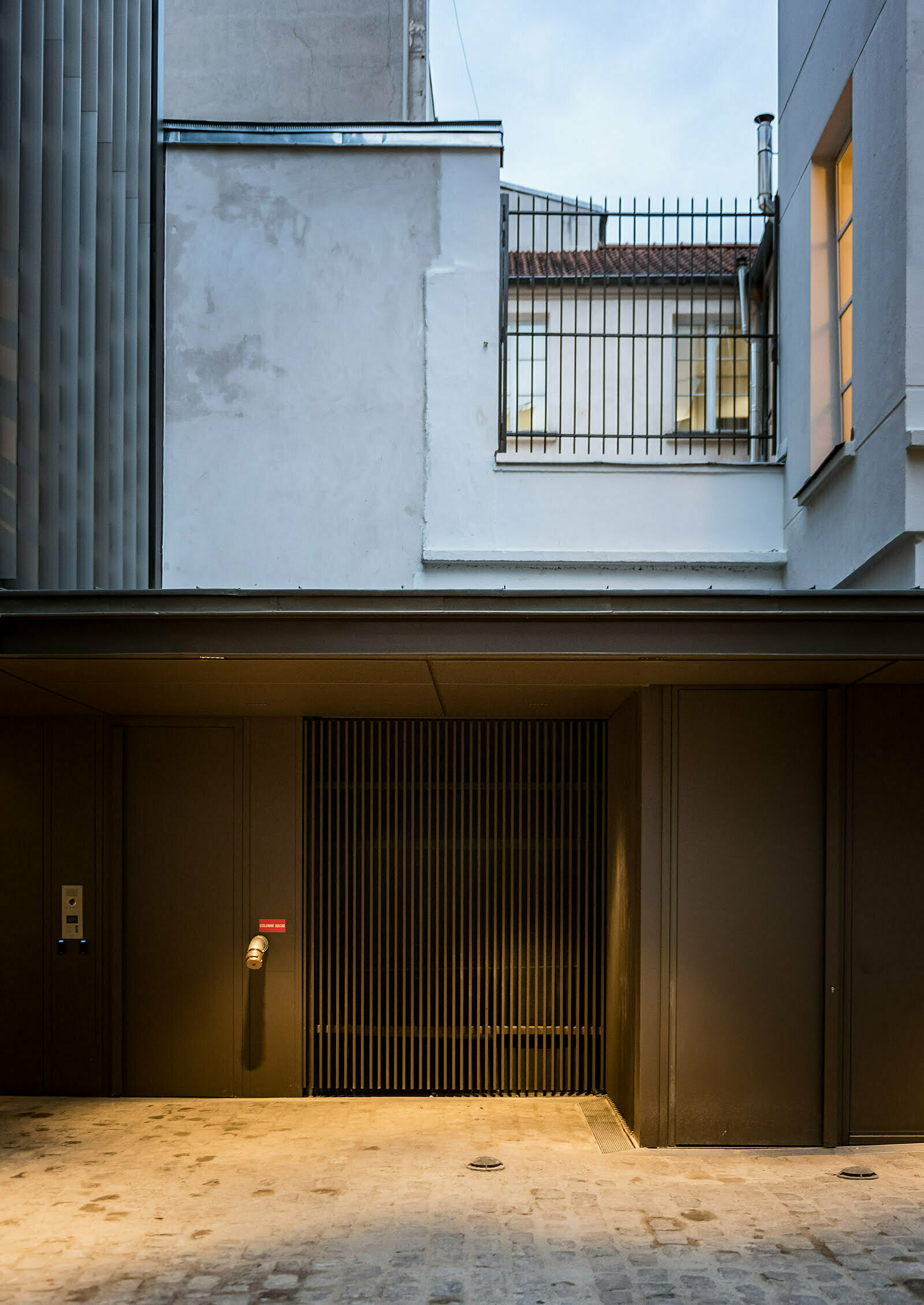 L’ensemble, d’une grande homogénéité chromatique, s’organise en fond de parcelle autour d’une cour pavée créée à l’occasion du projet et conçue sur le modèle du cloître. Les rez-de-chaussée abritent les salles d’expositions de la Fondation Henri Cartier-Bresson. Comme posé au-dessus, la façade du bâtiment de quatre étages qui regroupe les fonctions tertiaires de chacune des deux fondations est traitée en double peau et met en scène un écran décoratif en aluminium massif anodisé, qui tel une mantille garantit l’intimité des occupants autant que celle des habitants du bâtiment de logements qui fait face.