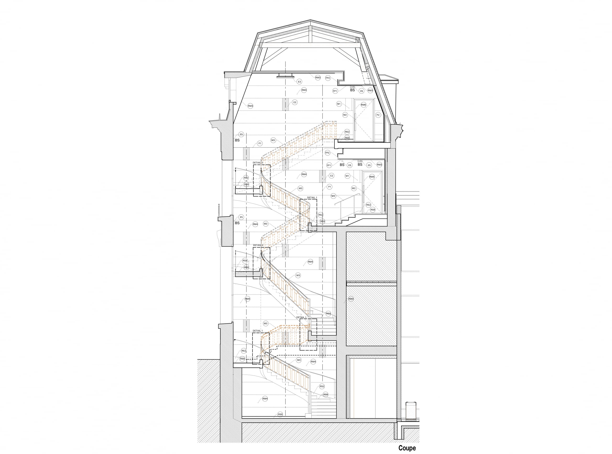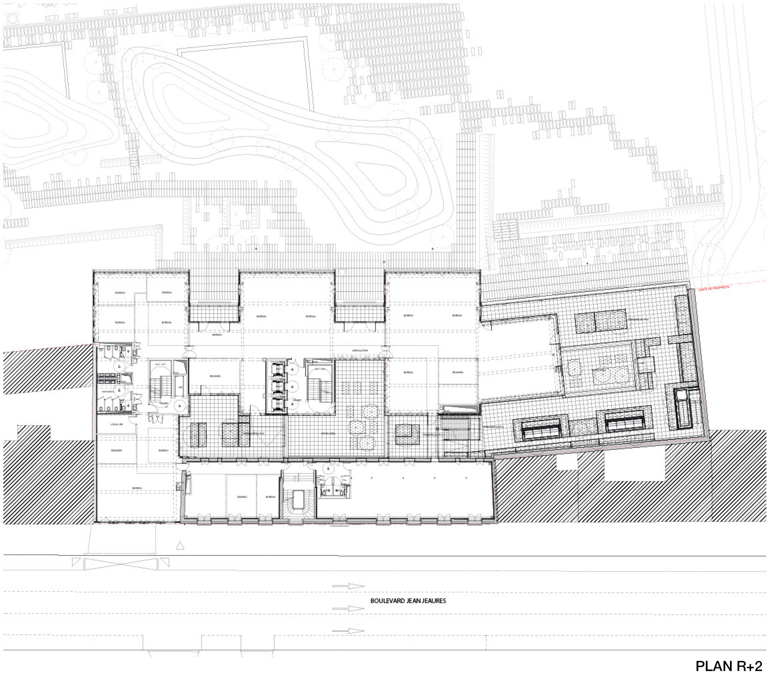 Le bâtiment neuf entre en résonnance avec le bâtiment de la Banque de France situé en vis-à-vis, en particulier par l’étagement d’une multitude de terrasses qui depuis le niveau du jardin jusqu‘aux toitures mettent le végétal au cœur du bâtiment tout en offrant des lieux de travail atypiques en plein air.
