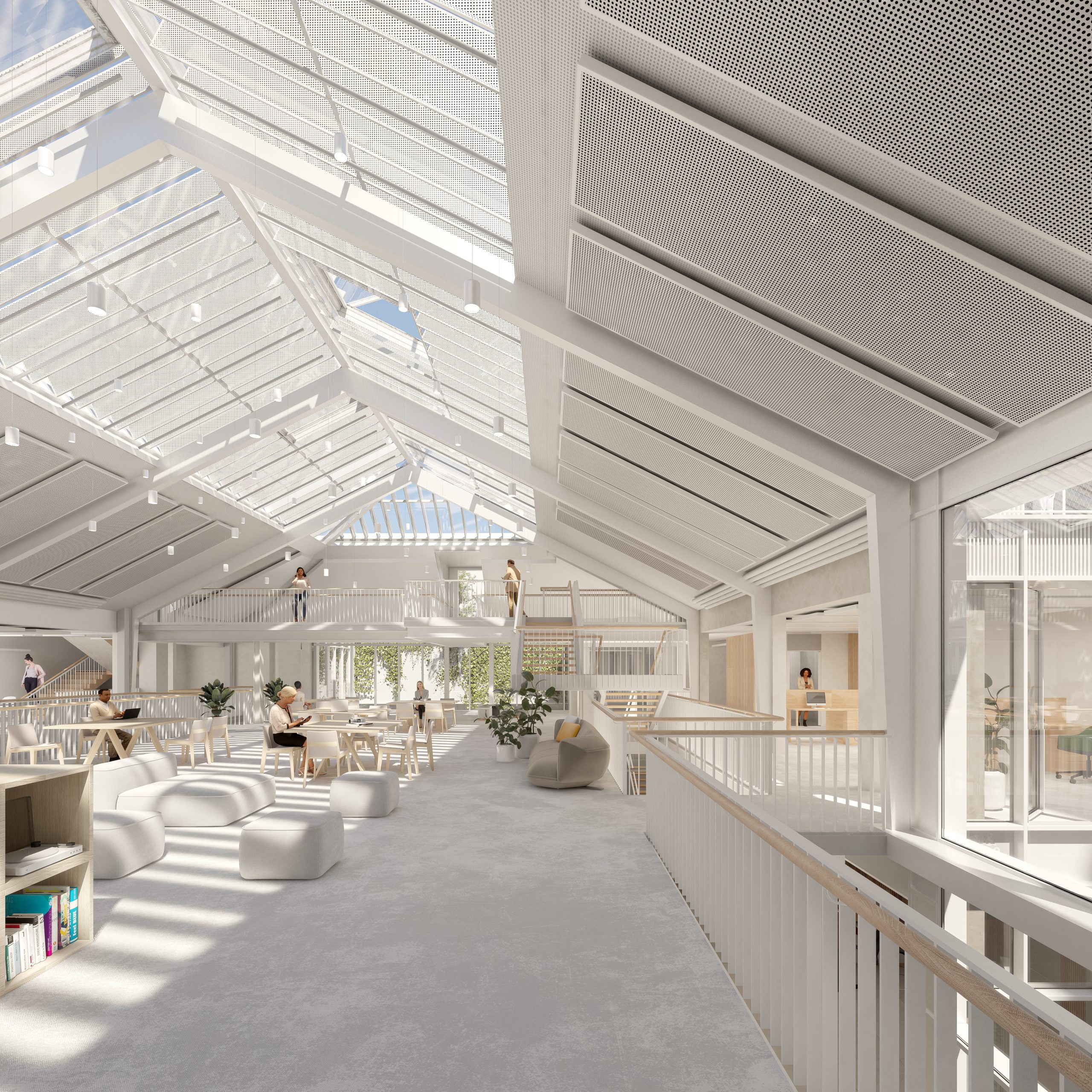 Cette métamorphose se fait sans dénaturation. Bien au contraire : l’identité d’origine — grande toiture centrale portée par les portiques Hennebique en béton armé, empreinte du passé industriel — est révélée et prolongée par la sobriété de l’intervention. Le projet revendique une esthétique du déjà-là.