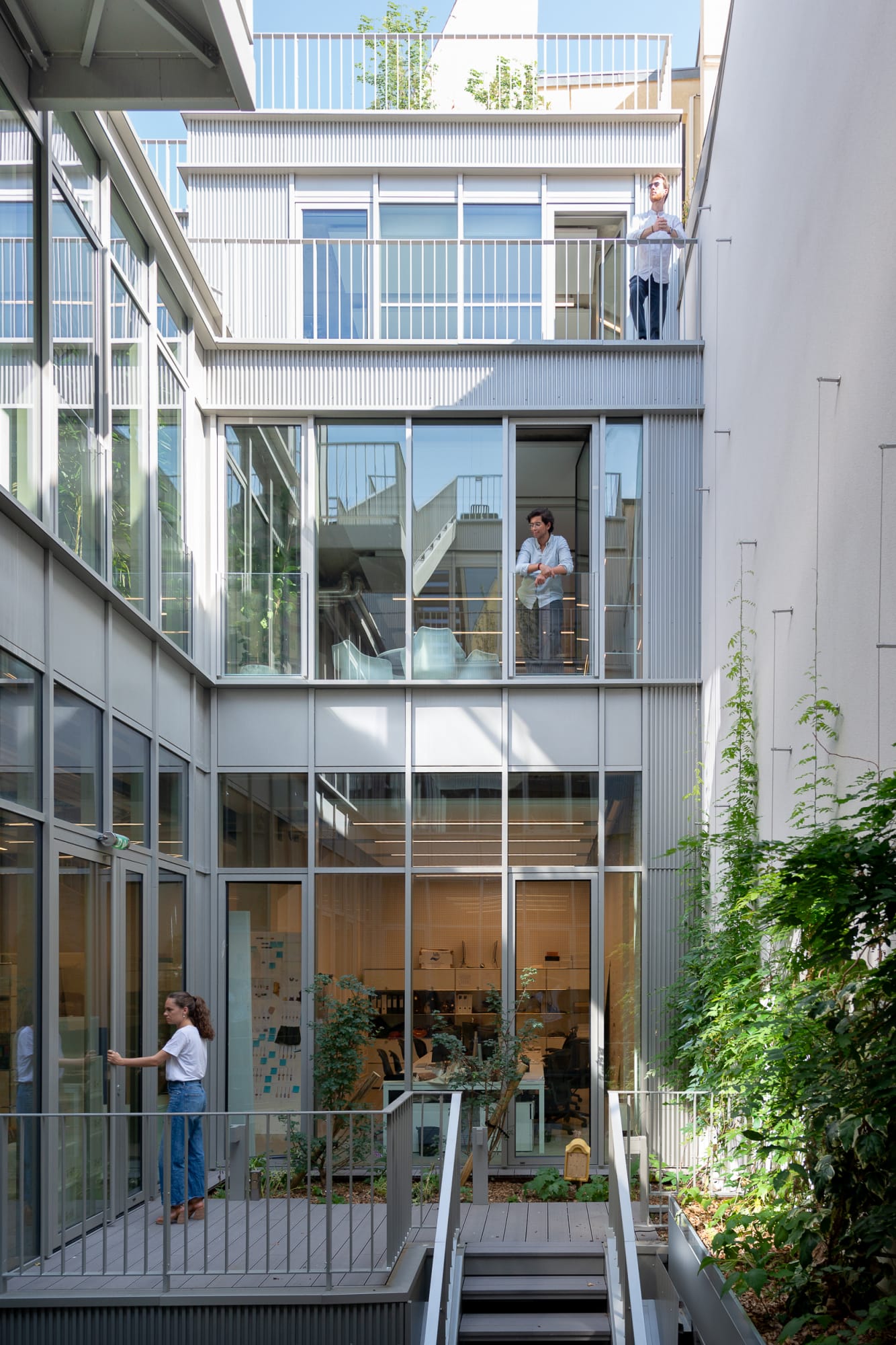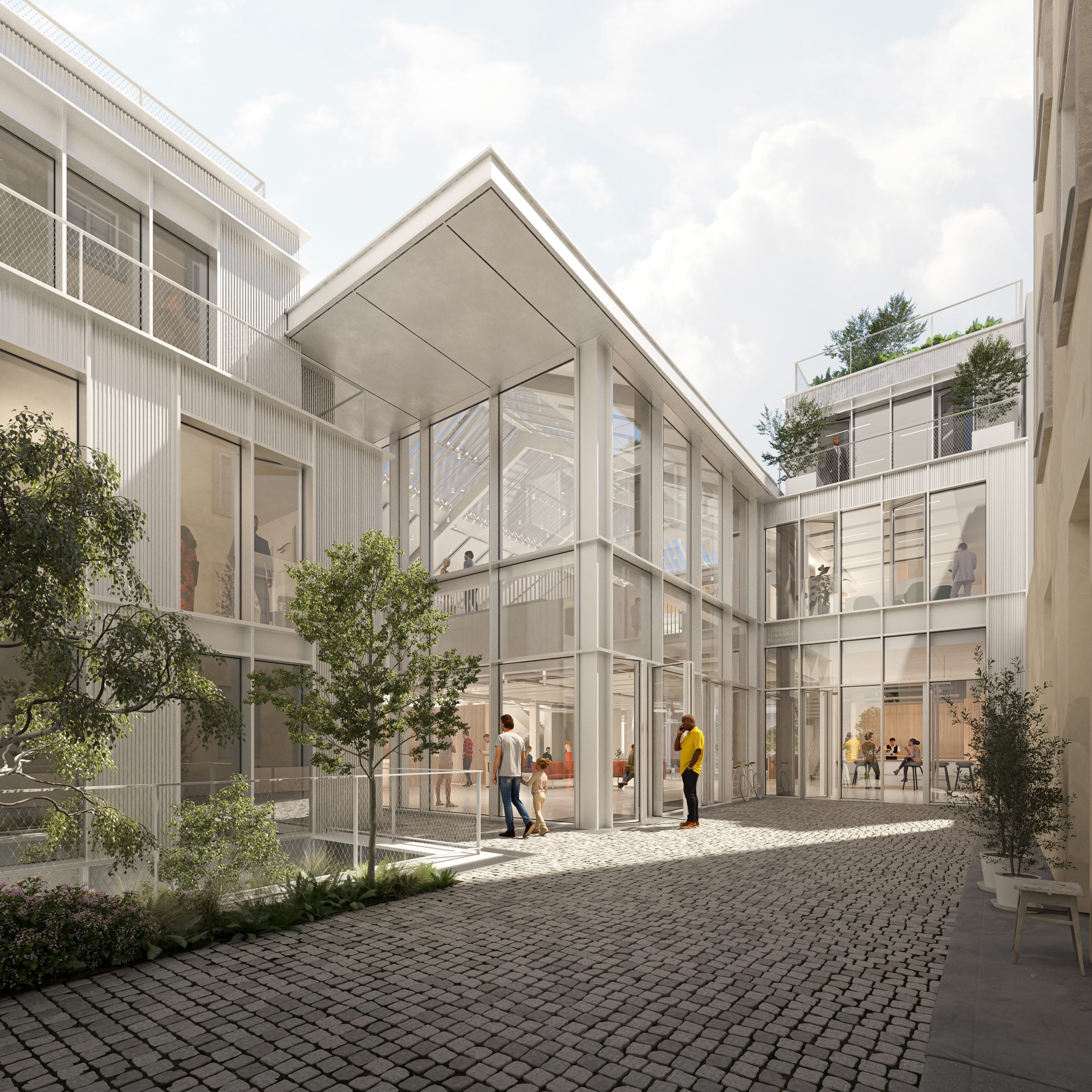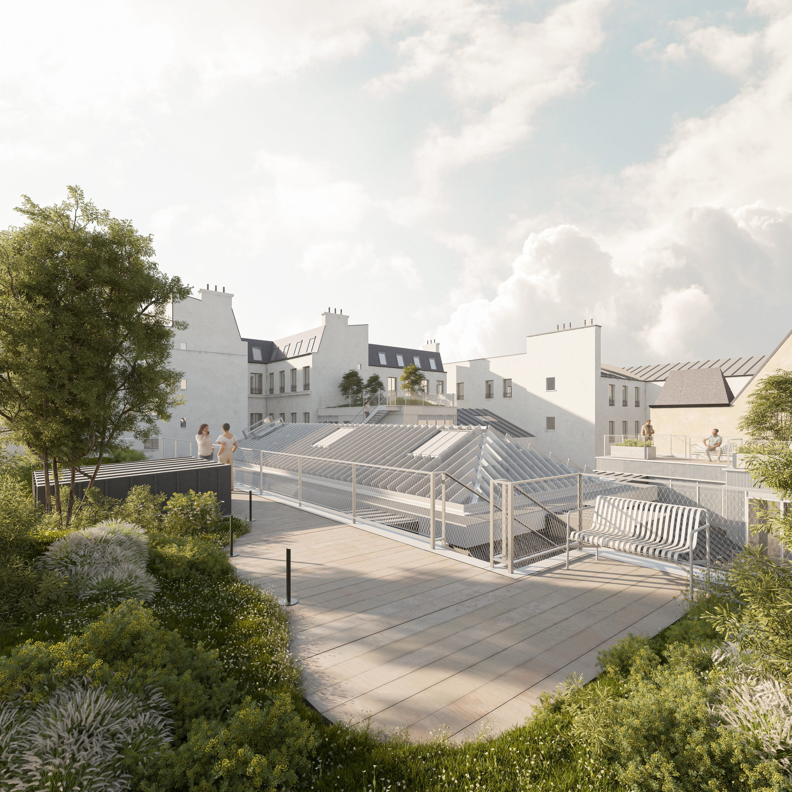 La végétalisation agit comme catalyseur de cette reconversion : les patios créés en pleine terre et l’ensemble des toitures terrasses deviennent des jardins, supports de biodiversité et apports de fraicheur pour les usagers et les avoisinants.
